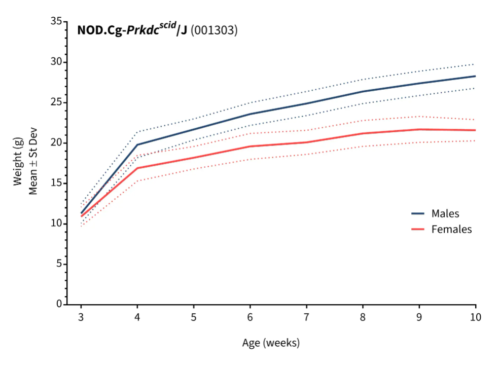 scid mice that have serum Ig levels greater than 1 ug/ml are considered "leaky". scid leakiness is highly strain dependent, increases with age, and is higher in mice housed under non-SPF conditions. In general, Prkdcscid leakiness is low on the NOD/ShiLtSz genetic background.